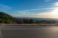 A man rides his bike along an asphalt road, with majestic mountains in the background. The coastal landscape offers an overlook of the highland vegetation. The sun is visible, casting a sunny glow over this picturesque dawn view.