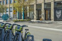 This stock photo features bikes parked in the middle of a street in Los Angeles, California, USA. The modern architecture of the buildings in the background adds to the urban feel of the city. People can be seen walking along the side of the street, creating a lively city atmosphere. The road is paved with asphalt, and yellow lane markings indicate the designated lanes for vehicles. In the foreground, there are trees adding a touch of greenery to the urban landscape. This image captures the vibrant city life and metropolitan atmosphere of Los Angeles, making it a great representation of city living, transportation, and urban design.