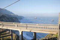 the bridge over the ocean is elevated and looks out to the beach and a sea