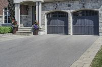 This stock photo showcases a stunning black and white brick home situated in Toronto, Canada. The home features dark colored garage doors, flower containers on the front, and a beautiful facade. The house is located in a peaceful residential area, surrounded by trees. The brick wall, arch, and stone wall add a touch of elegance to the property. The walkway and driveway are made of asphalt, providing a smooth surface. The image captures the essence of a sunny day, highlighting the architectural details of the building. It is an ideal representation of suburban living in Toronto.