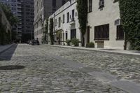 This image captures the charm of an urban street with cobblestone surfaces and stone sidewalks. The road surface is lined with parked cars and there is an outdoor bench awaiting visitors. The building facades display a mix of architectural designs and windows add character to the scene. The street is adorned with lush vegetation, with trees lining the sidewalks. This photograph showcases the unique urban design and flooring of the area, offering a glimpse into the city's atmosphere and thoroughfares.