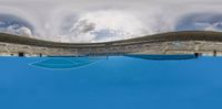 An elevated view of a tennis court covered in blue water, with a backdrop of a clear sky and fluffy clouds. The symmetrical court and white lines create a sense of symmetry and order. The stadium and crowd in the background add to the atmosphere of the game.