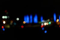 Blurred City Lights in the Dark with Bright Blue Lights Reflecting off the Buildings in the Distance