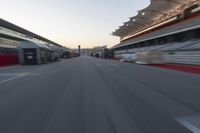 A mesmerizing photograph capturing the motion blur of a bus moving on a straight road near a terminal. The controlled access highway stretches far into the distance, creating a sense of movement and adventure. The clear sky above provides a beautiful backdrop to this urban infrastructure scene. The lane markings on the asphalt road indicate the direction and flow of traffic. The bus stands out as the main mode of transport in this image, symbolizing the hustle and bustle of city life. The race track and stadium in the background add an element of excitement and competition. The grandstand and finish line eagerly await the cars racing by, creating a sense of anticipation. The blurred image creates a dynamic and energetic atmosphere, evoking a feeling of speed and action.