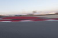 A dynamic and fast-paced image capturing a red motorcycle racing down a racetrack, creating motion blur. In the background, an airplane can be seen flying against a clear sky. The race track is lined with structures and surrounded by a plain with sand and water, offering a picturesque view. The reflection of the motorcycle and other elements can be seen on the smooth asphalt surface of the road. This photo symbolizes the excitement and thrill of racing as a mode of transport, while also showcasing the beautiful horizon and infrastructure of the location.