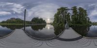 this is the 360 - time view of a boathouse on a river, with the sun behind a sky line