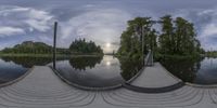 this is the 360 - time view of a boathouse on a river, with the sun behind a sky line