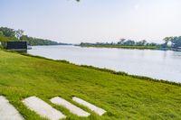 the grassy area is filled with stairs and boats in the water near trees and grass