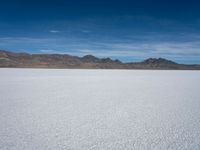A breathtaking view of the Bonneville Speedway in Utah. The clear sky and open space create a stunning backdrop for the EPC cars racing across the salt surface. The majestic mountains and serene desert landscape complete the picture.