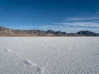 a wide open desert area with mountains and snow covered ground around it, in a blue sky