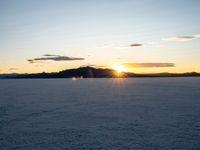 the sun is setting over a field covered in snow and mountains are visible behind it
