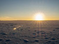 a bright, sun shines down over the snow - covered ground of a vast plain