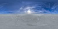 An expansive salt flat stretching across the horizon under a bright sunny day, with the vibrant sun visible. The endless landscape presents an open space within a desert environment, casting a skydome of light.