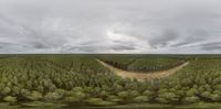 Brandenburg's rugged forest landscape under a grey sky. Aerial view showcases the greenery of open spaces and grass surfaces. Sky dome and clouds add depth to this peaceful German location.