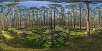 Panoramic view of a lush forest in Brandenburg. The open space allows for off-road exploration and tracks through the dense vegetation. Deciduous trees with green foliage create a vibrant landscape.