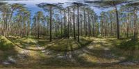A lush green forest in Brandenburg, Germany. The picture shows a dirt road surrounded by pine trees. The straight road leads to an open space, creating a scenic off-road track.