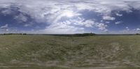 a wide shot from a fish - eye lens of a green field on a sunny day