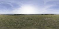 Vast Brandenburg landscape under a sunny day sky. Open grassy spaces filled with greenery. The sun visible through scattered clouds creates a picturesque German nature scene.
