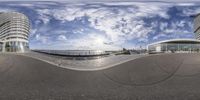 A fisheye lens captures a unique perspective of Bremen's business district. The large circular object in the foreground adds a touch of modern architecture. The clear sky and grey buildings create a striking contrast. A vibrant city life in Europe's harbor city.