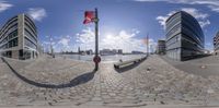 A picturesque view of Bremen's historic city center. Cobblestone alleyways and brick buildings create a charming atmosphere. Reflections in the windows of an office building capture the essence of city life.