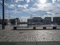 a bench on a paved street overlooking the water with a sun beam and other buildings in the distance