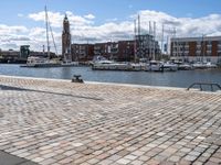 This is an image of a cityscape in Bremen, Germany. The photo showcases a waterfront area with buildings, a road surface, and a pier. The classic and modern architecture stand in contrast against the cloudy sky. Cobblestone roads and a jetty add to the urban design of the city. The image captures the vibrant city life and coastal atmosphere of Bremen. This picture represents the blend of history and modernity that can be found in European cities like Bremen.