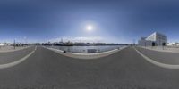 A fish-eye view of Bremen's city skyline, with modern architecture and industrial buildings. Clear skies highlight the symmetrical patterns of the urban design. The composite materials and glass facades create a sleek and contemporary look.