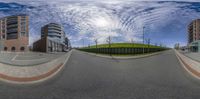 an image of a distorted fisheye lens showing some buildings on the street and a park