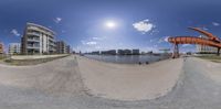 A fisheye lens captures the vibrant city life of Bremen, Germany. The bike trail winds next to the picturesque lake, surrounded by modern architecture and lush vegetation. Bright sun illuminates the buildings, creating a stunning scene.