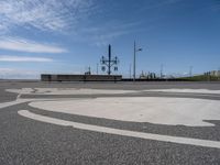 This is an image of a sidewalk in Bremen, Germany paved with a circular pattern. In the distance, two people can be seen crossing the street. The clear sky above contrasts with the landscape of the harbor and open space. The road surface is made of asphalt, typical of European cities. This photo represents a typical day in Bremen, where pedestrians can enjoy the plaza and jetty along the harbor. The circular pattern of the sidewalk adds a unique touch to the city's infrastructure.