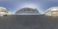 large passenger ship at dock in glass building area of port city, as seen through fisheye lens