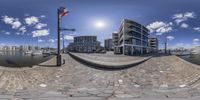 Modern residential complex in Bremen, Germany, located by the water with sailboats in the background. The fish-eye lens captures the unique architecture against a clear sky. A perfect blend of urban design and coastal living.