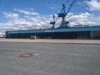 A boat docked at the pier in Bremerhafen, Germany. The clear sky and the calm waters of the harbor create a serene atmosphere. The naval architecture of the boat stands out against the horizon.