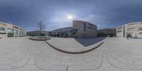 A 360-degree view of modern architecture in Bremen, Germany. Three buildings with different angles and distinct materials create a symmetrical urban design. Sidewalks and open spaces invite city life. Clear sky adds to the vibrant atmosphere.