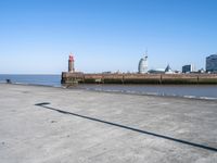 Bremerhafen's coastal cityscape provides a serene setting with modern architecture. The calm, azure waters of the ocean contrast with the clear sky and concrete streets. A perfect spot for relaxation by the waterfront.