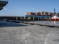 a boat is docked in the water near a dock and dockside with many containers on it