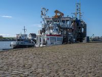 A boat docks at the pier in Bremerhafen, Germany. The city's industrial landscape is seen against a clear sky. Cobblestone streets and urban design add to the city life. A perfect day on the water.