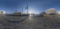 Bremerhafen, Germany: A sunny day in the city with a clear sky. Modern architecture and brick facades line the cobblestone road. Old ship boats on display create a unique urban design. A landmark in this coastal city.