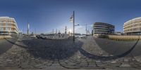 Bremerhaven's lively waterfront with ships docked at the pier. Modern architecture blends with historic buildings and flags fluttering in the clear sky. A bustling transport hub by the water, capturing the essence of city life.