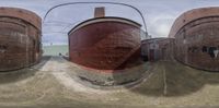 two large red pipes with one empty cylinder in the center of them in the middle of an outside brick building