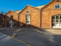 This stock photo features an empty street in Barcelona, Spain, with tall brick buildings in the background. The sunlight filters through windows, casting beautiful shadows across the cobblestone walkway. The clear sky and classic architecture add to the charm of this European city. The hard shadows on the brick walls and asphalt surface create a visually striking image. Perfect for showcasing the cultural center and architectural beauty of Barcelona.