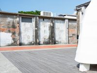 a large piece of white in a wooden floor next to brick buildings and a long white wall