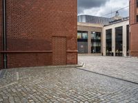 This image captures the classic architecture of Berlin, Germany. The brick walkway is flanked by two red brick buildings, one of which has an outside entrance and a bench. The cobblestone surface adds to the charm and character of the courtyard. The clear sky above provides a beautiful backdrop to the scene. This photo showcases the architectural beauty and open spaces of Berlin, a city rich in history and culture. It is a perfect representation of the European charm and elegance that is prevalent throughout Germany.