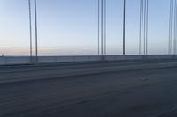 A beautiful composite of a cable-stayed bridge at dawn, spanning over a highway with asphalt road surface. The morning sunlight creates a vibrant atmosphere, casting a motion blur effect on the parallel lines of the road. The azure sky with a hint of grey provides a clear and picturesque backdrop for this mesmerizing infrastructure.