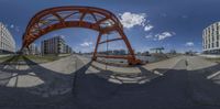 the view from a fish - eye lens of the large bridge that spans the canal
