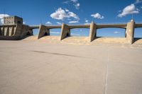 This image captures a sunny day in Los Angeles, California. A skateboarder is seen soaring through the air above a concrete bridge and ramp in an open space. The clear sky provides a stunning backdrop to the scene. The photo showcases the urban landscape of Los Angeles and the passion for skateboarding that is prevalent in the city. It represents the freedom and thrill of skateboarding in the bustling metropolis of California.