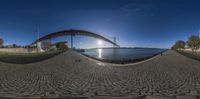 A stunning fisheye view of a cable-stayed bridge in Lisbon, Portugal. The bridge spans over calm waters, with the city's skyline and a large dock in the foreground. The clear sky and sunlight create a picturesque scene. A perfect day for cycling and recreational activities.