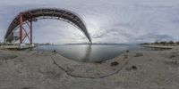 A fish eye lens captures the motion of a bridge as it crosses over the calm waters of the ocean in Lisbon, Portugal. The straight road leads to an open space, with the horizon and beach in the distance.