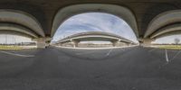 a fish eye lens picture of the view of a bridge from a parking lot underneath