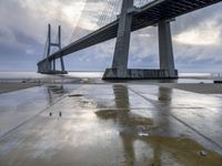 This stock photo showcases a stunning view of a bridge in Lisbon, Portugal. The photograph captures the bridge's reflection on the calm water below, creating a symmetrical and serene image. The city's vibrant skyline can be seen on the horizon, adding to the beauty of the scene. The concrete surface of the bridge contrasts with the open space of the water, providing a captivating perspective. The clear sky and fluffy clouds overhead enhance the overall peaceful and coastal ambiance of the photo.